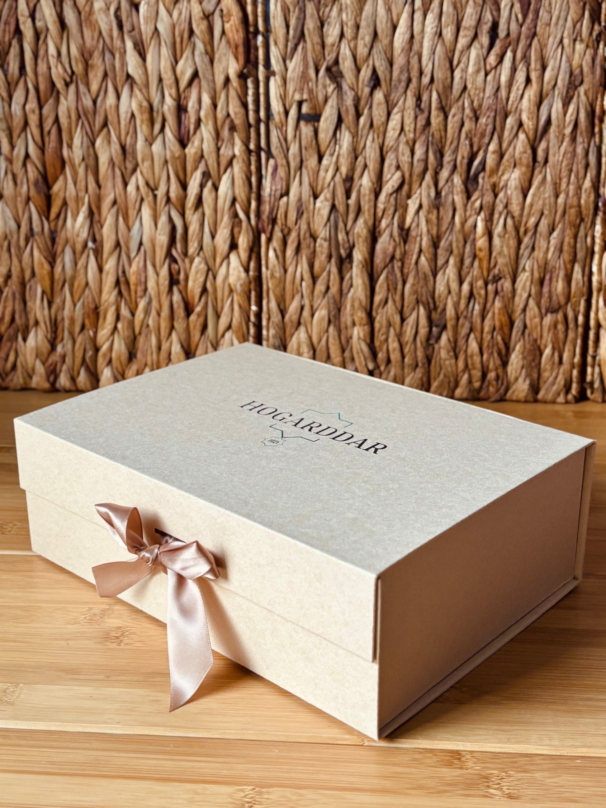 Caja premium de cierre imantado y lazo, con el Hadiz 779 de Sahih Muslim en la parte superior, cuidando de cada detalle con respeto.