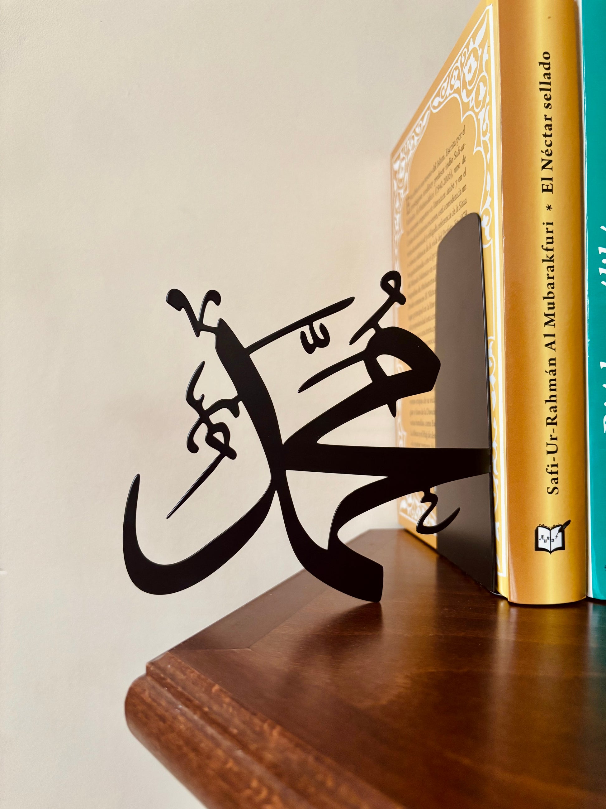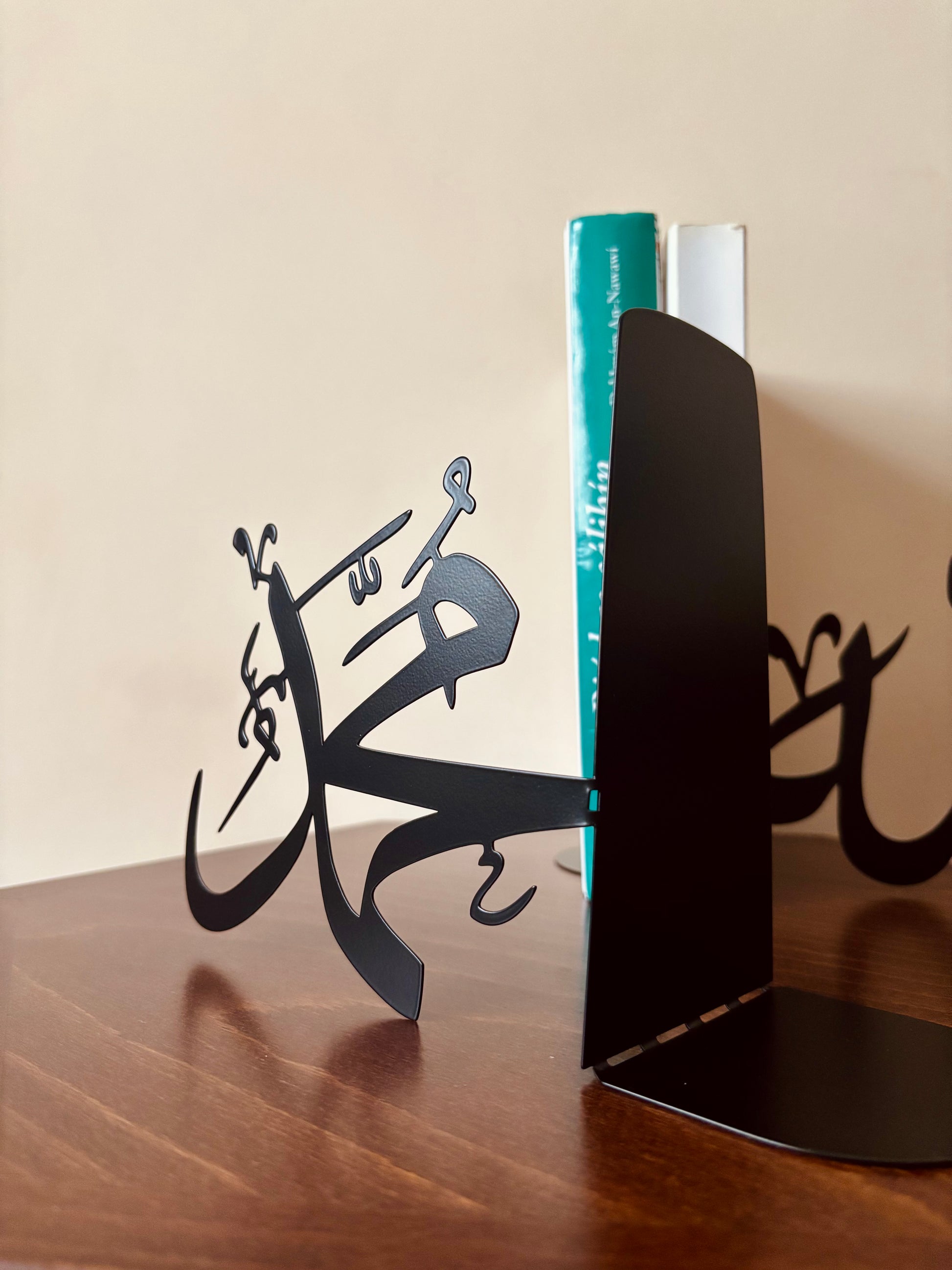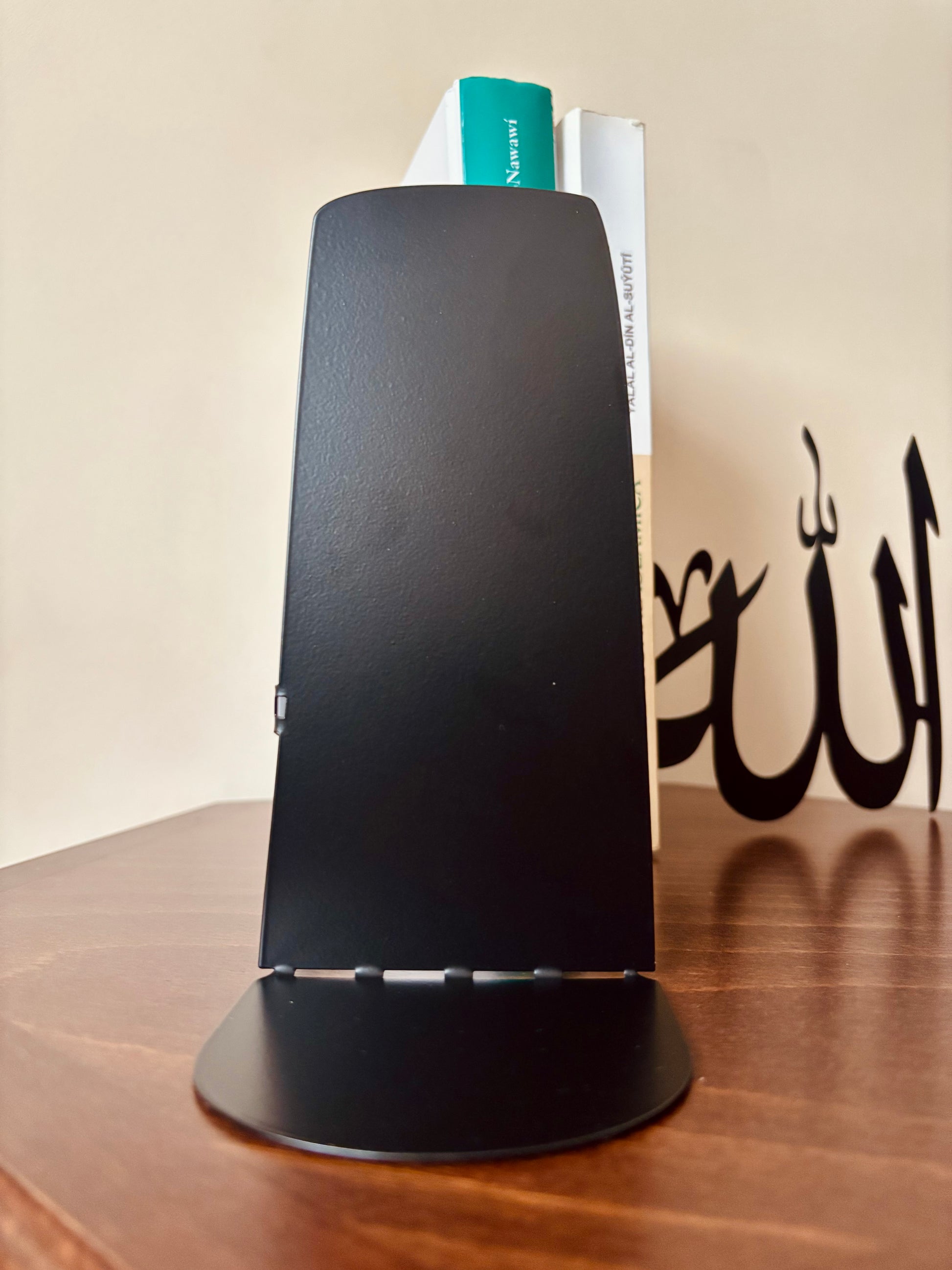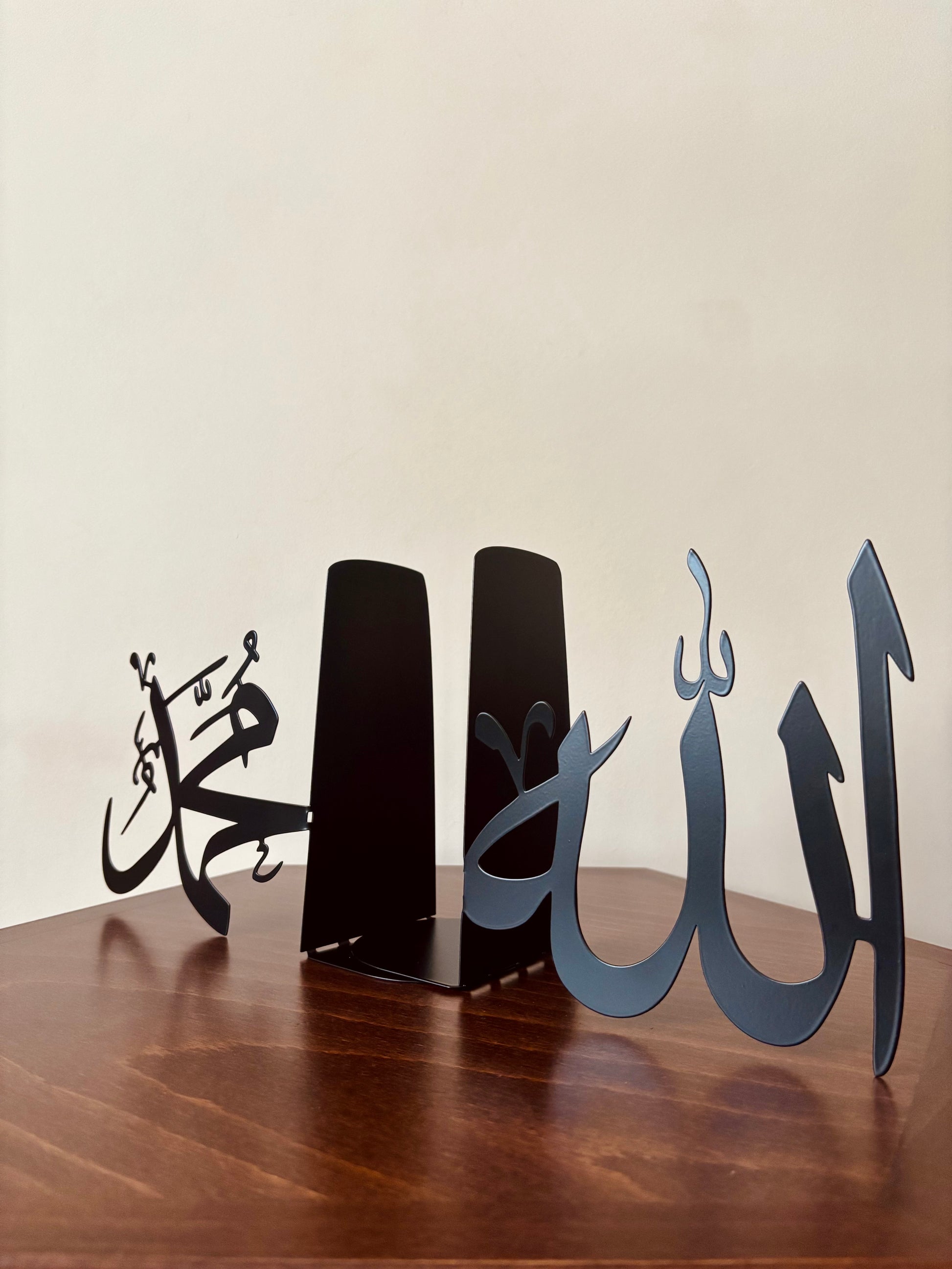 This unique bookstand has been designed with Muslim homes in mind, which value both functionality and spiritual significance. Each side features delicate Arabic calligraphy | Allah الله · Muhammad محمد ﷺ | precision laser-cut from high-quality metal with a matte black finish.