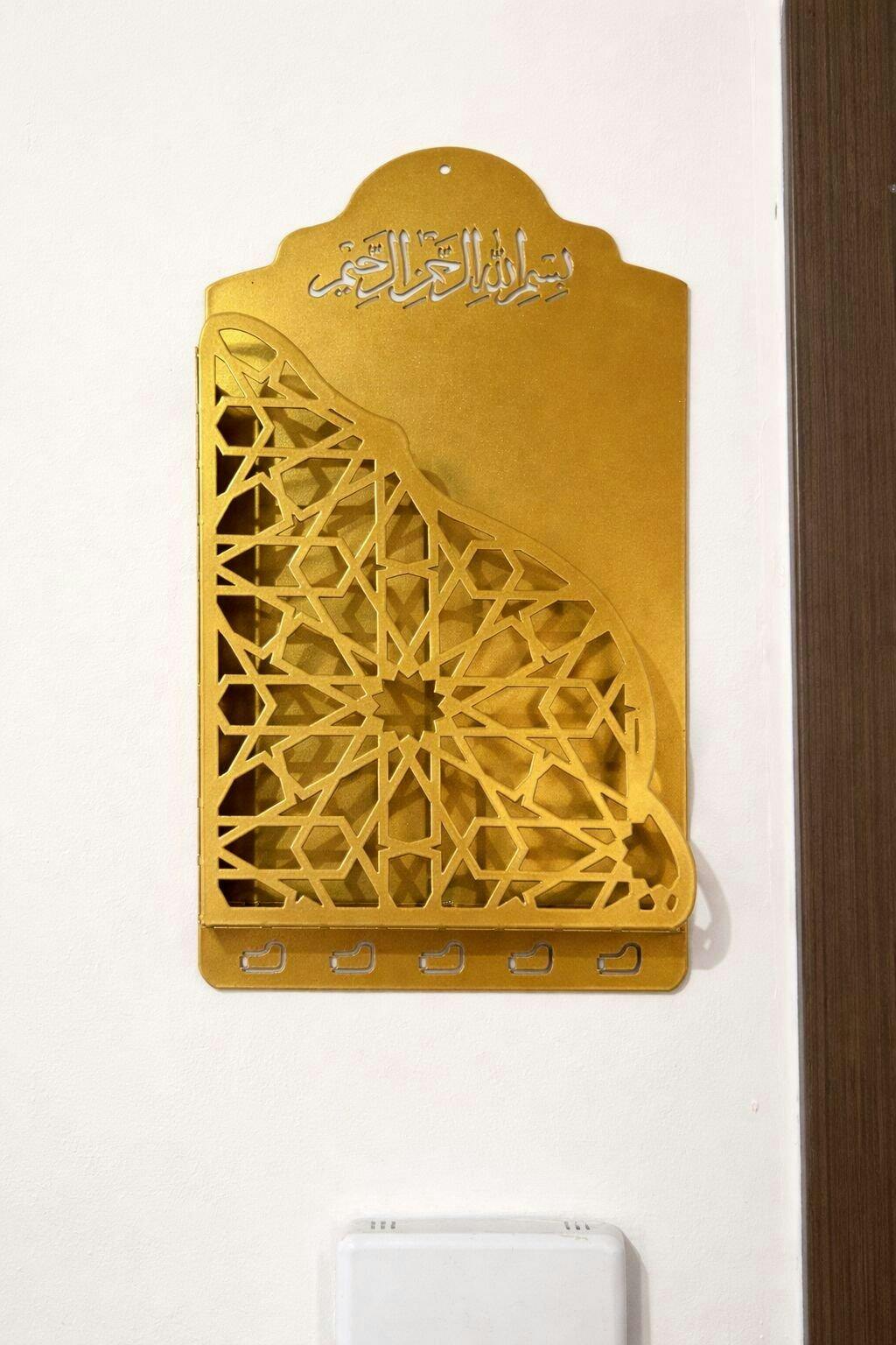Featuring an openwork Arabic design laser-cut into metal, this piece combines modern precision with the classic aesthetics of Islamic art, achieving an elegant, clean finish that is full of spiritual identity.