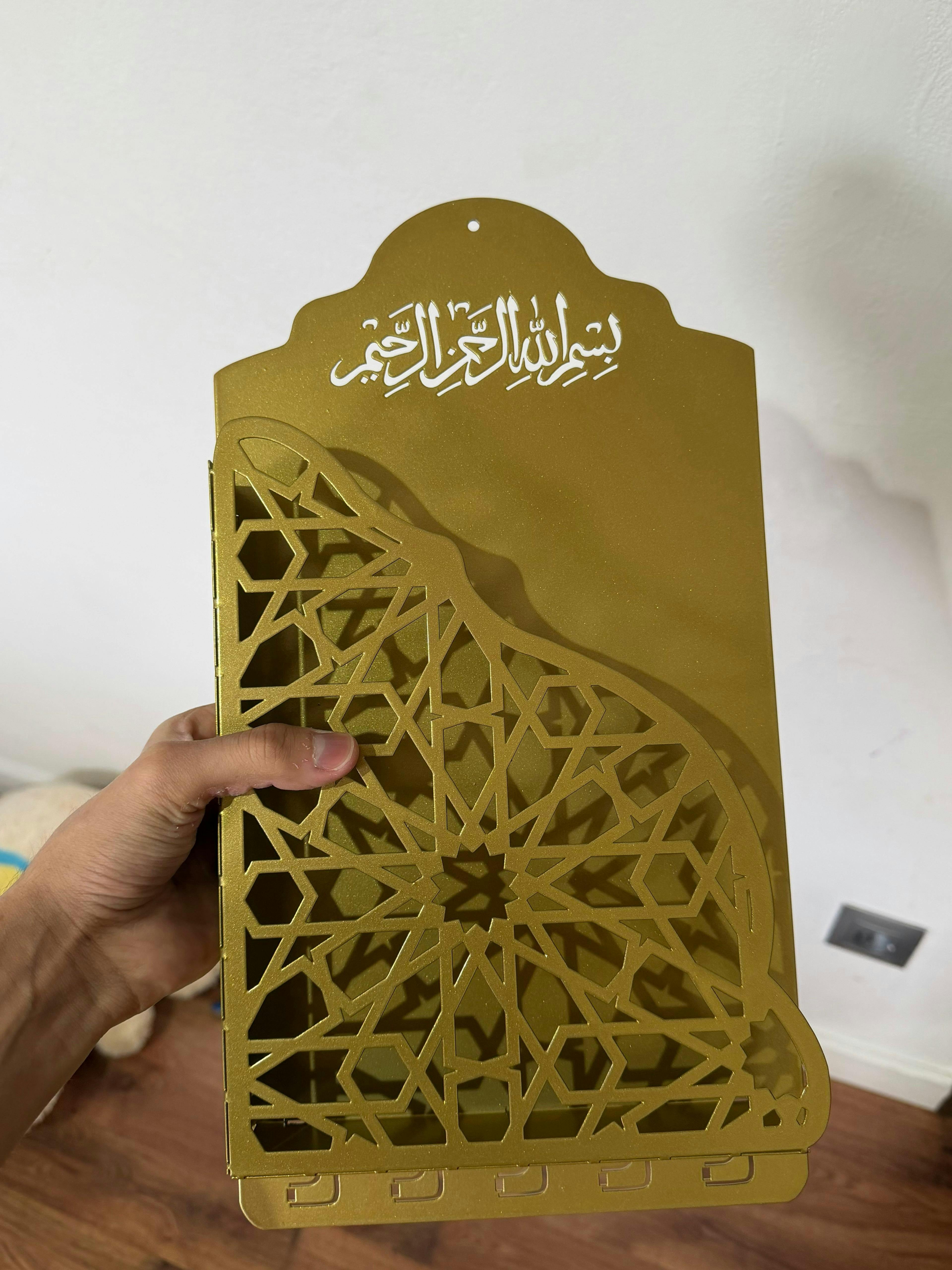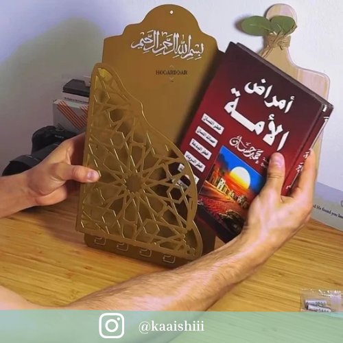 - Este soporte de pared ha sido diseñado especialmente para guardar con respeto y belleza tus libros islámicos más preciados, en especial El Noble Corán القرآن الكريم, junto a tus misbaha مِسْبَحَة.