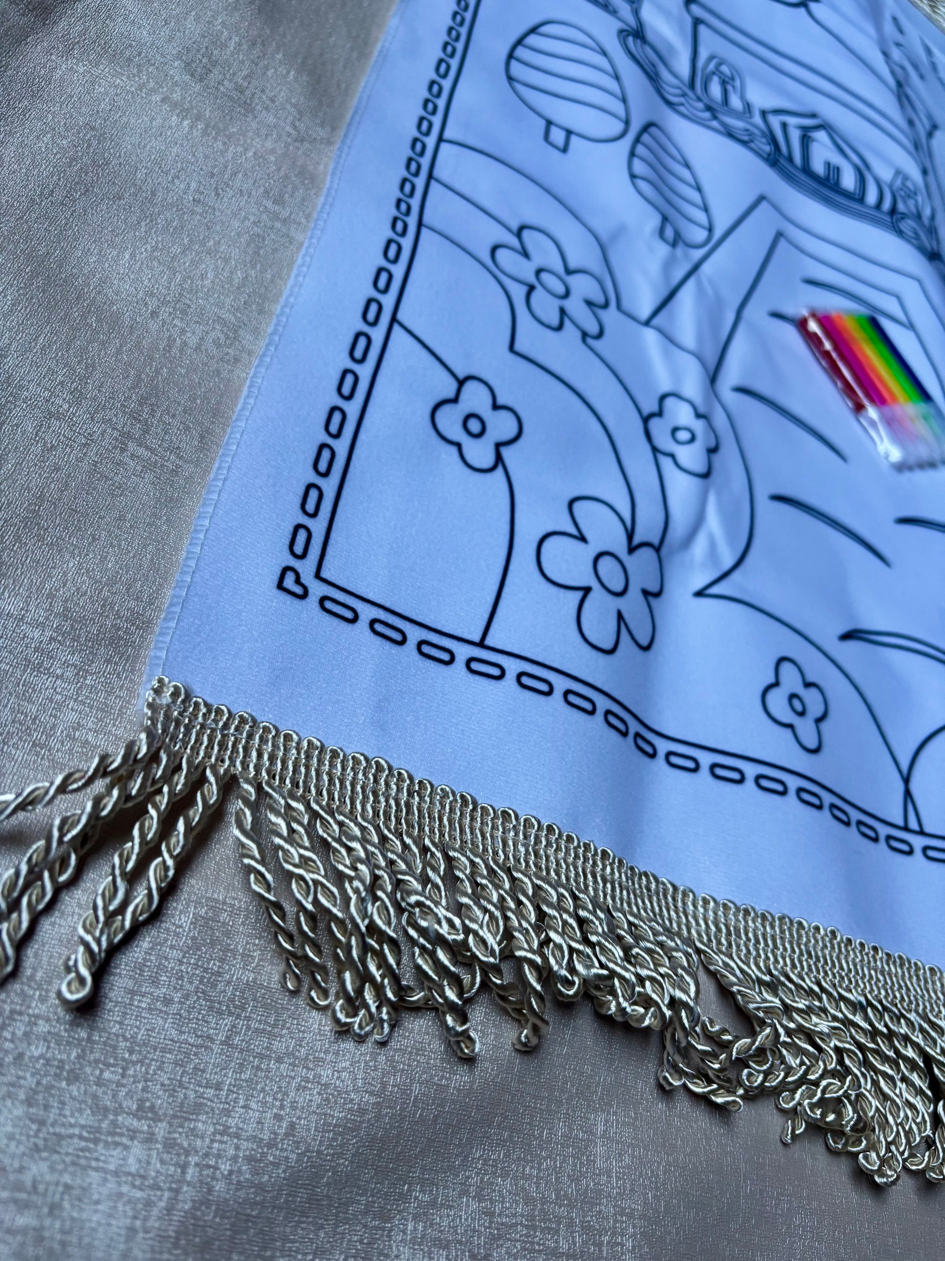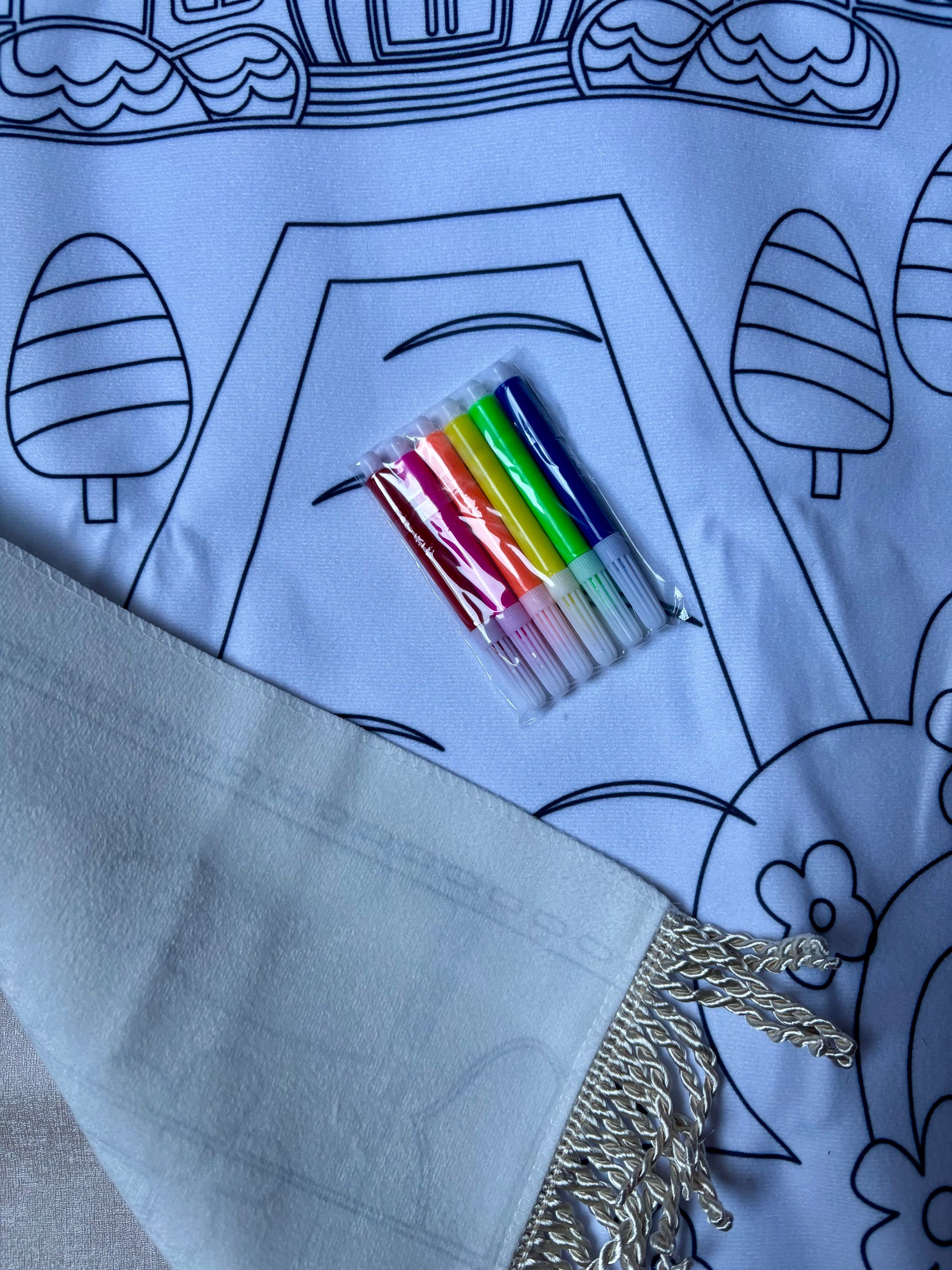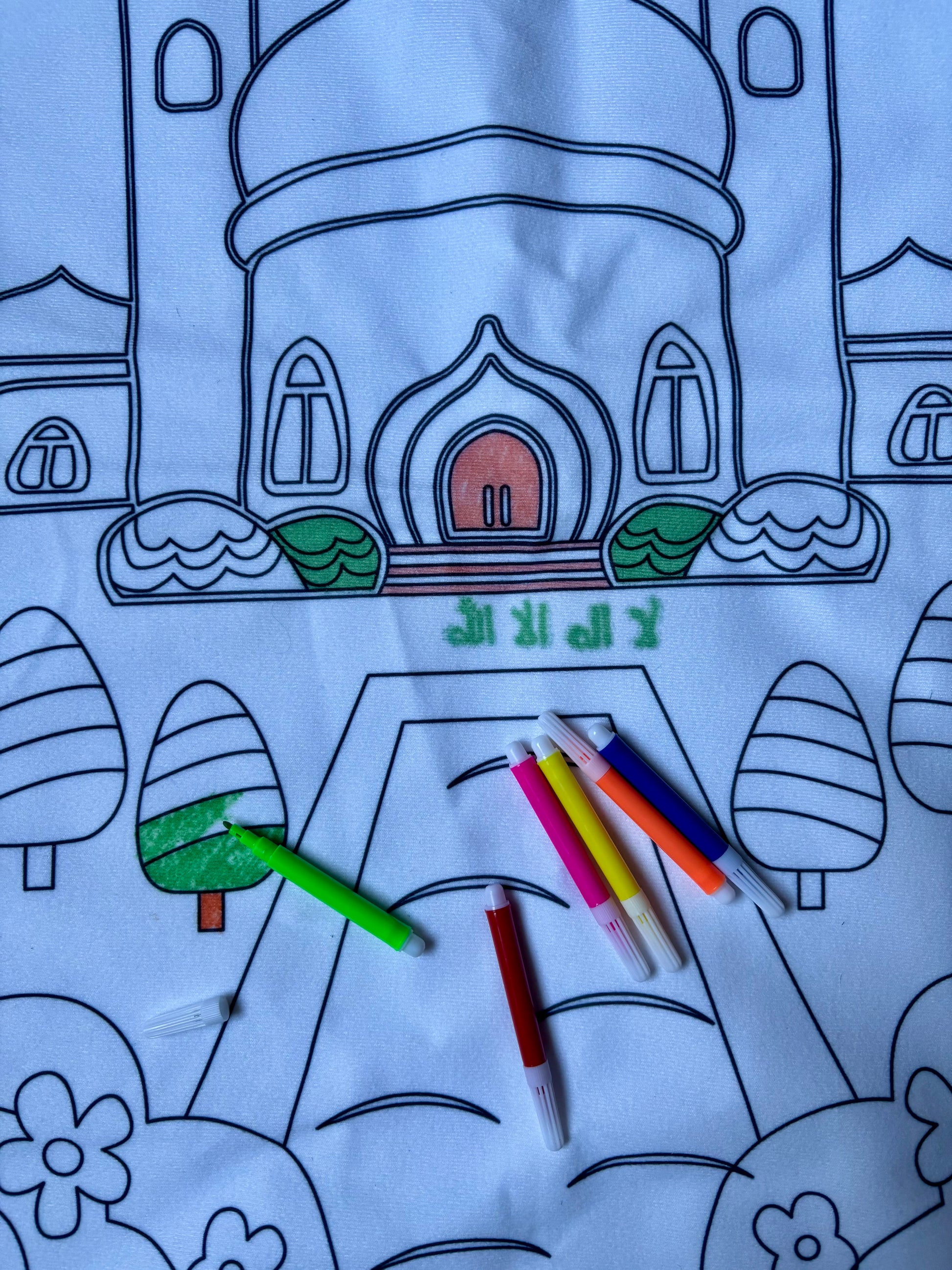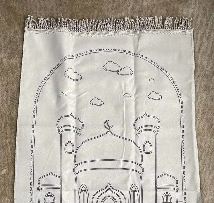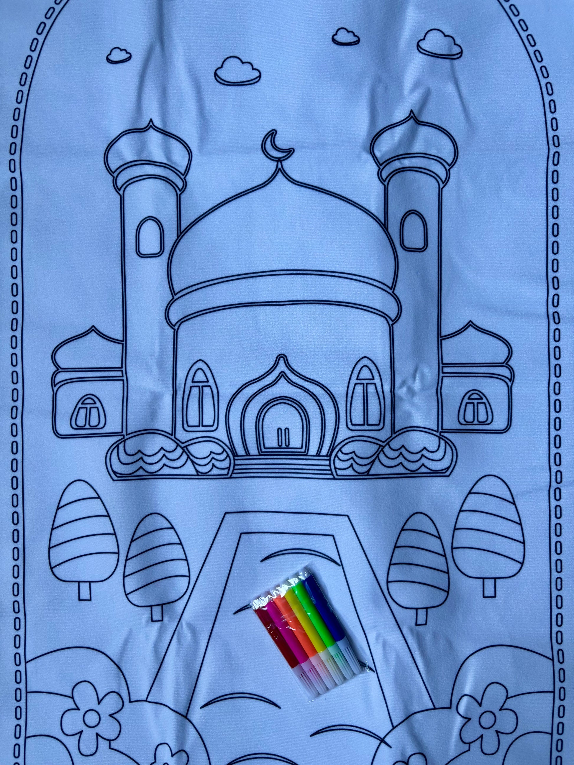 Descubre una forma única de conectar con el rezo -Salat صلاة- a través del juego, el arte y el aprendizaje. Esta alfombra de rezo coloreable y lavable está diseñada especialmente para la Ummah الأمة más joven, siendo también perfecta para toda la familia. Fabricada con materiales seguros y calidad resistente, permite que los pequeños del hogar coloreen libremente con rotuladores lavables y luego puedan reutilizarla tras cada lavado.